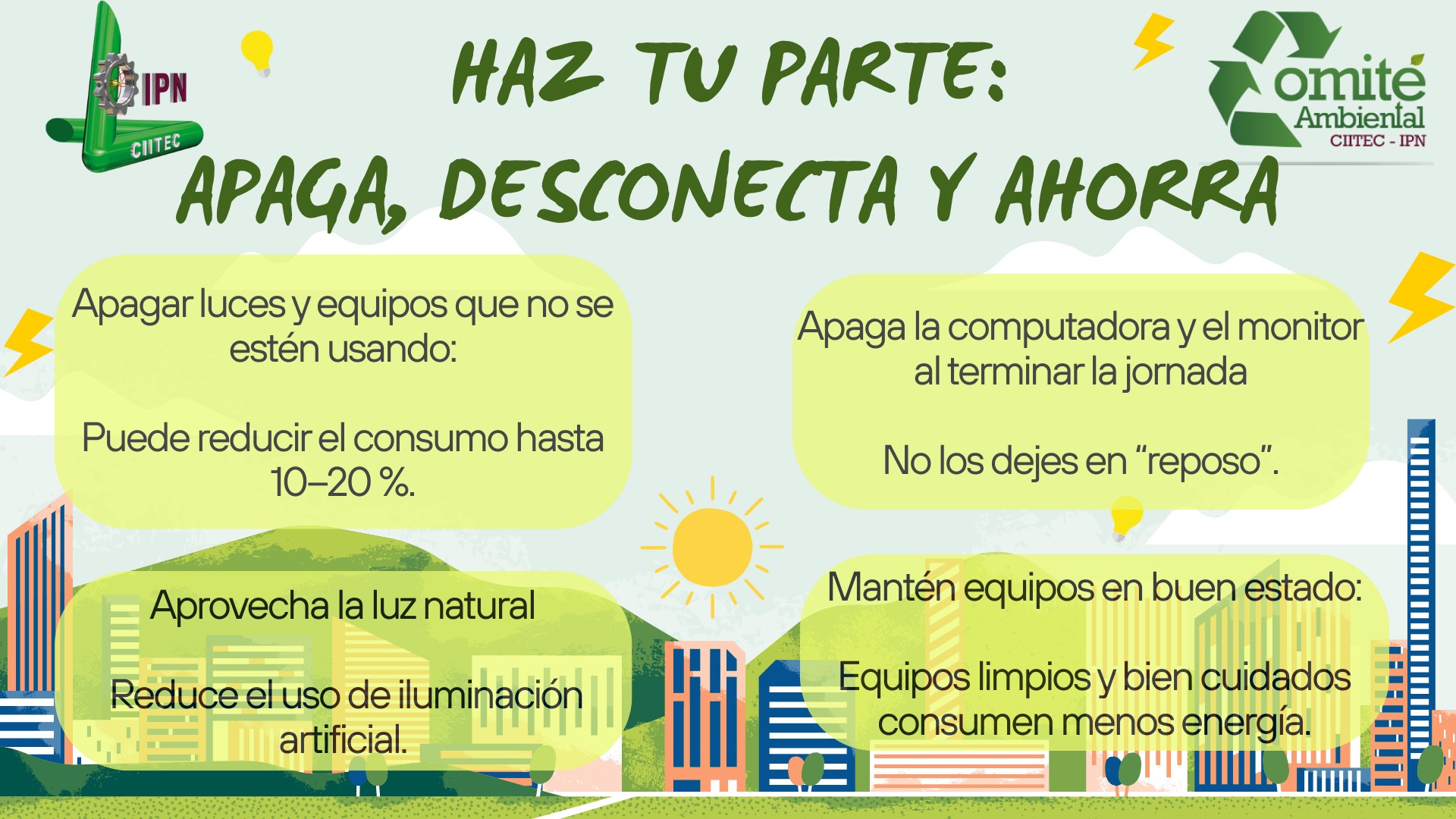 Somos un grupo de personas interesadas en la conservación del medio ambiente y el uso responsable y eficiente de nuestros recursos naturales. Fungimos como enlace con la Coordinación Politécnica para la Sustentabilidad y tenemos como tarea principal, supervisar el cumplimiento y aplicación de las políticas y lineamientos institucionales en materia de sustentabilidad fortalecidos siempre por nuestros procesos de Planeación.