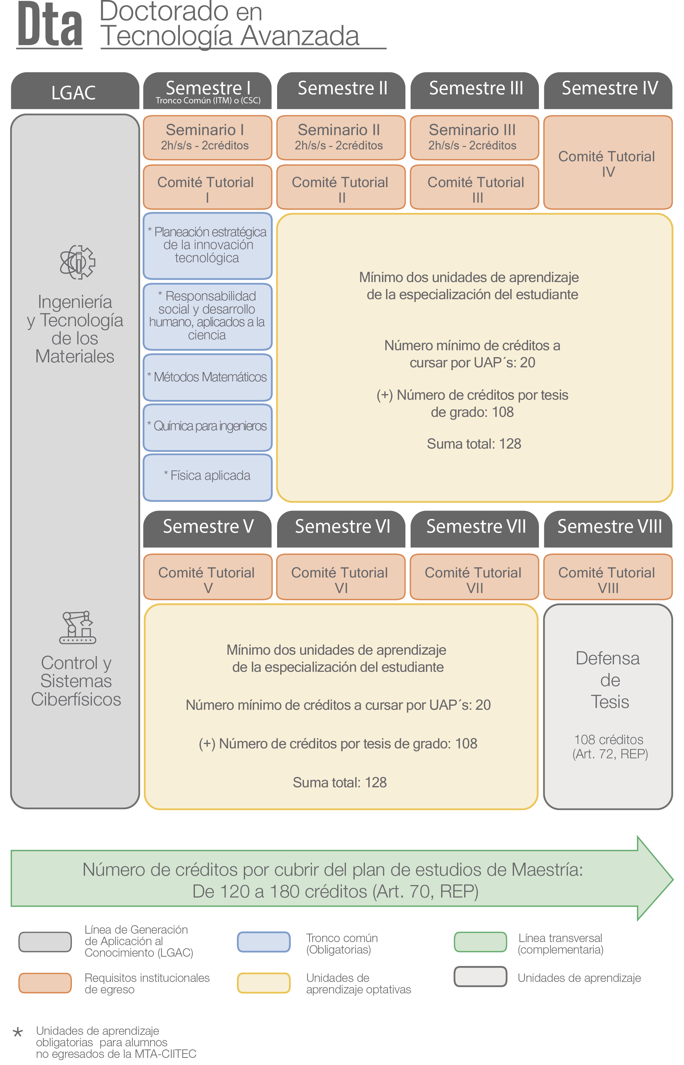 La estructura curricular de los programas de posgrado del CIITEC se basa en un plan que contempla un máximo de ocho semestres para obtener el Grado de Doctor. El plan de estudios es personalizado y enfocado a la realización de actividades de investigación. Los tres seminarios departamentales son de carácter obligatorio y las unidades de aprendizaje sobre innovación se incluyen en caso de que el estudiante no las haya cursado en niveles previos. Las materias optativas tienen la finalidad de desarrollar fortalezas adicionales para la realización de su investigación.